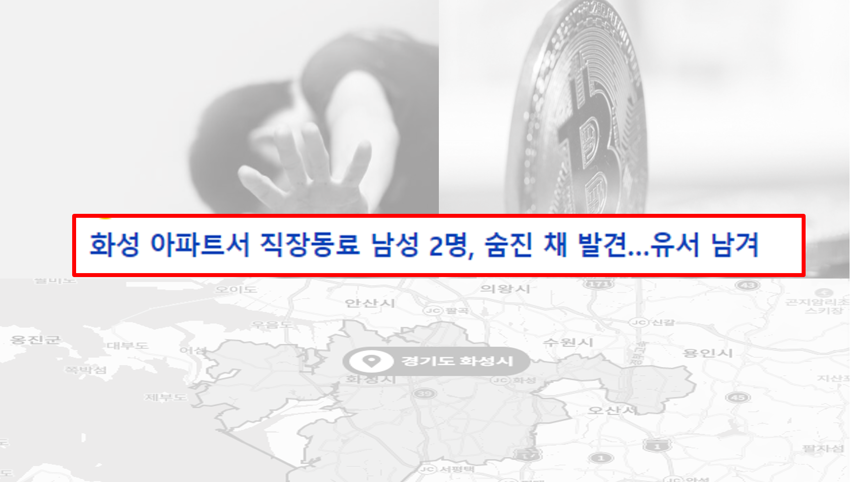 경찰에 따르면 26일 오후 5시 10분께 화성시 장지동의 한 아파트에서 A씨(30대)와 B씨(30대)가 숨진 채 발견됐다. 아파트는 A씨 자택인 것으로 확인됐다.