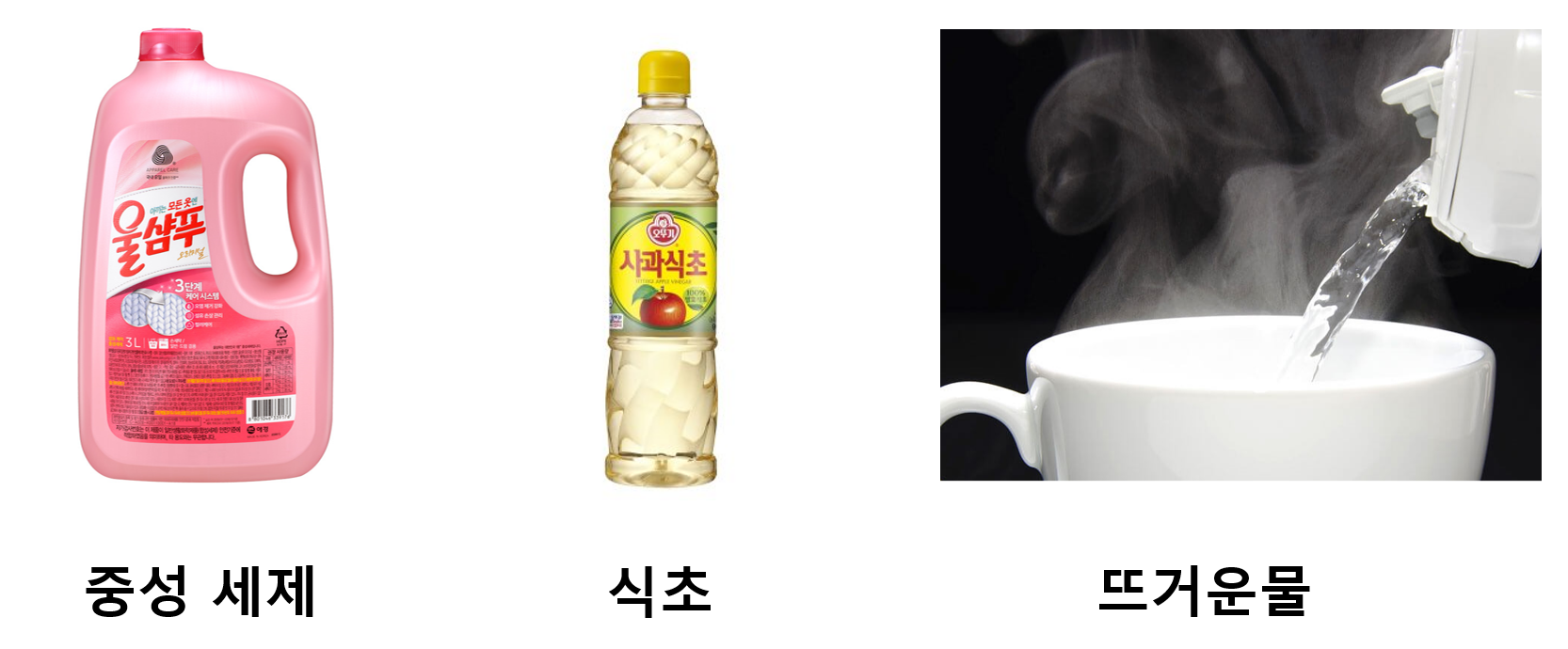 4) 물의 온도는 높을수록 얼룩 제거에 효과적이지만 40도 이상에서는 변형이 생길 수 있으니 주의하고 부드러운 솔을 사용해서 문질러도 좋습니다.